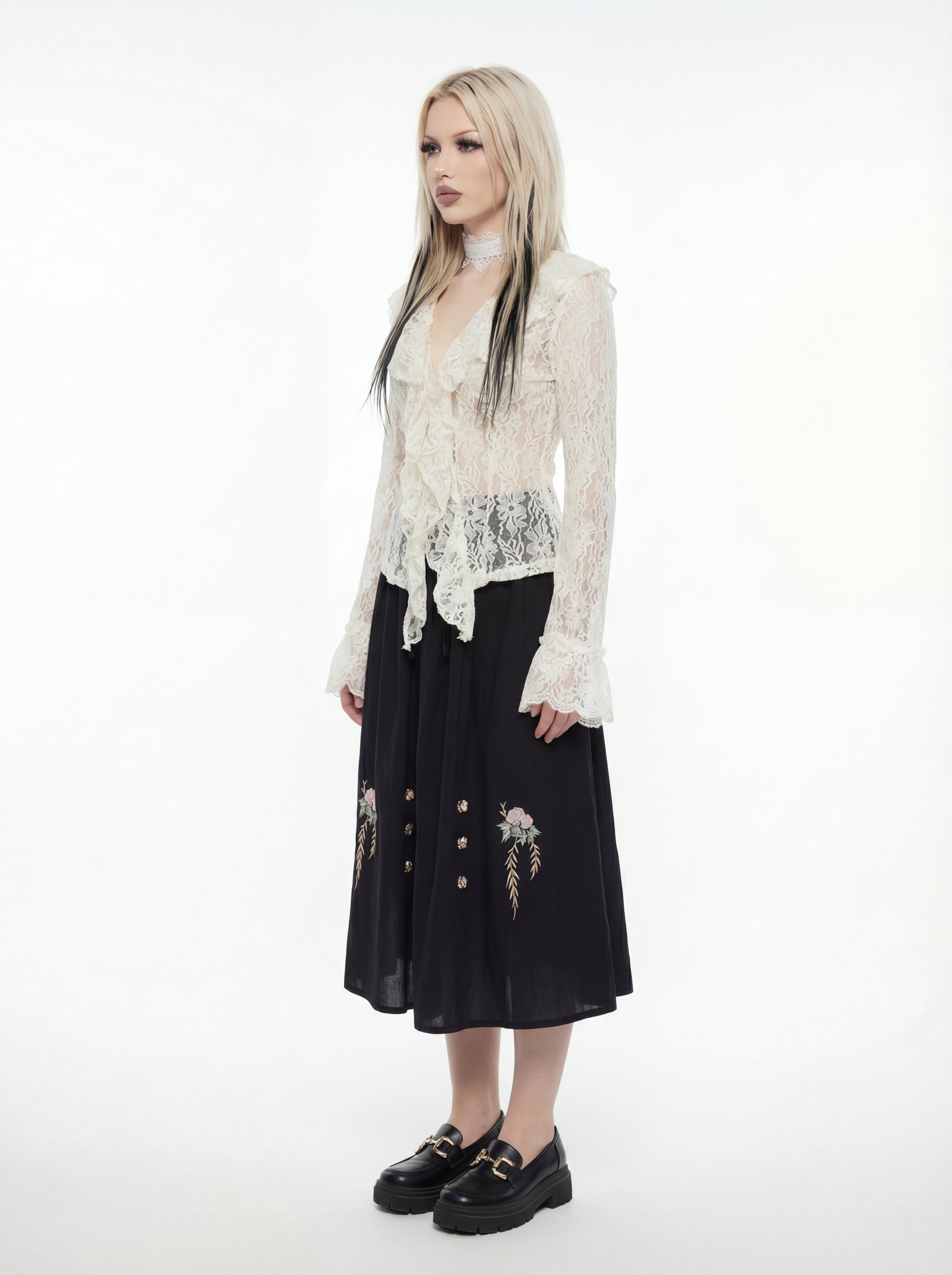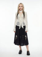 A vision for the restless writer and the manor’s ghost - the Haunted Quill Blouse flows like ink on parchment. A gothic shirt stitched from lace and lonely hours, made for those who find beauty in the biting wind and the silent hall. Delicate in texture, untameable in spirit.