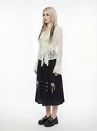 Romance with a jagged heart - sheer ivory lace that cascades in heavy ruffles down the plunging neckline. Flared bell sleeves capture the restless energy of the moors, while the pointed hemline mimics the sharp edges of a love that refuses to fade. It clings to the waist and flutters like a frantic wing against a windowpane. The essence of the desolate heights - airy, ornate, and wickedly fragile.