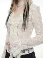 • Design: Ruffled Floral Lace Blouse with Flared Cuffs