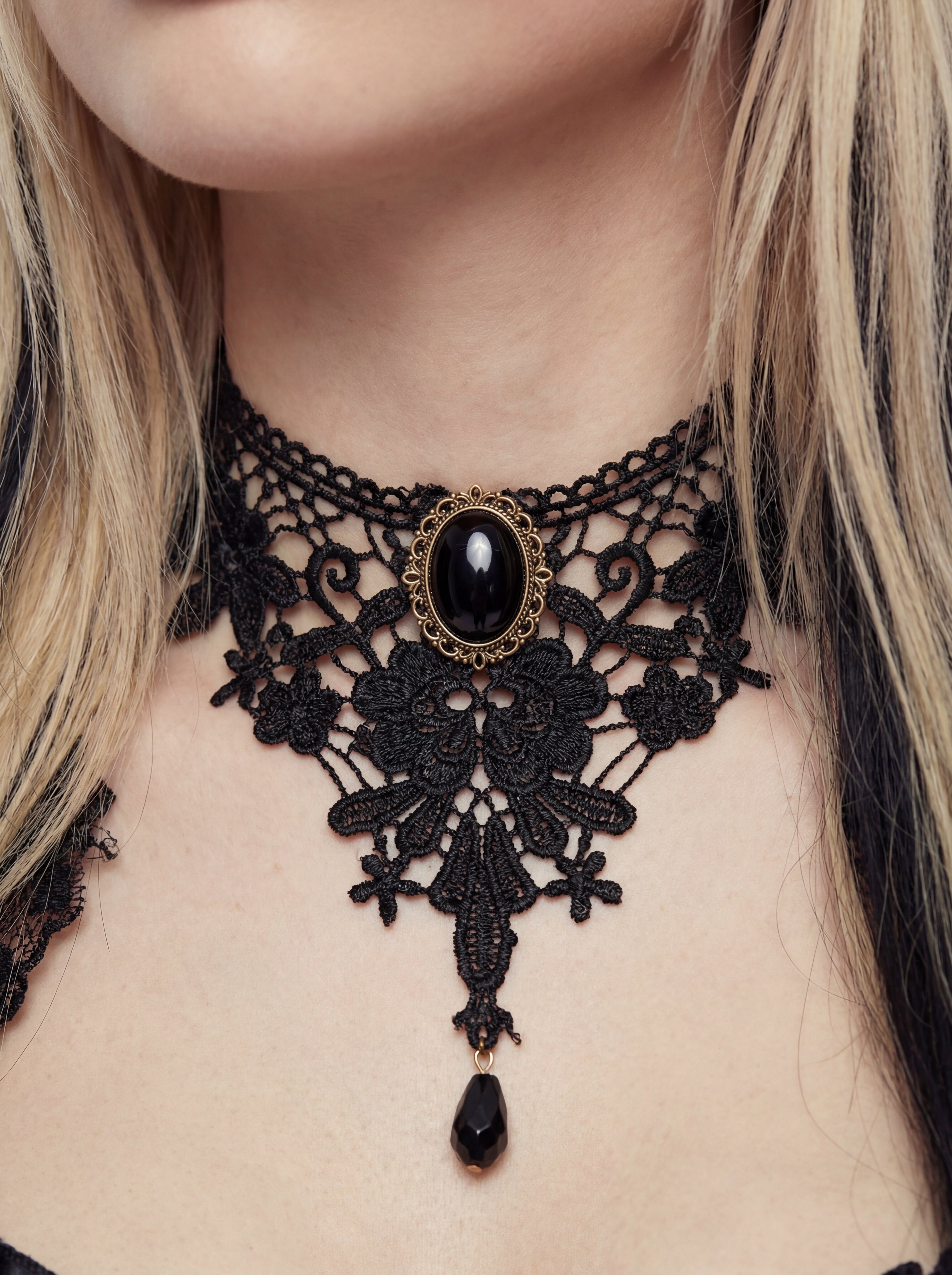Darkness with a regal glint - delicate black guipure lace that fans across the skin like the wings of a fallen bird. A deep obsidian cabochon sits at the heart, framed by ornate bronze filigree, while a single teardrop bead catches the dim light of a dying fire. It fastens like a promise and hangs like a heavy memory. The essence of the ruin - ornate, intimate, and wickedly timeless.