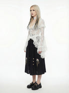 Fragility with a sharp edge - sheer floral lace that clings like a cobweb to a forgotten statue. Dramatic bell sleeves and a cascading ruffled hemline that trail behind you like the echoes of a lost song. It binds at the waist and flows like a spirit refusing to depart. The essence of ethereal noir - haunting, delicate, and wickedly romantic.