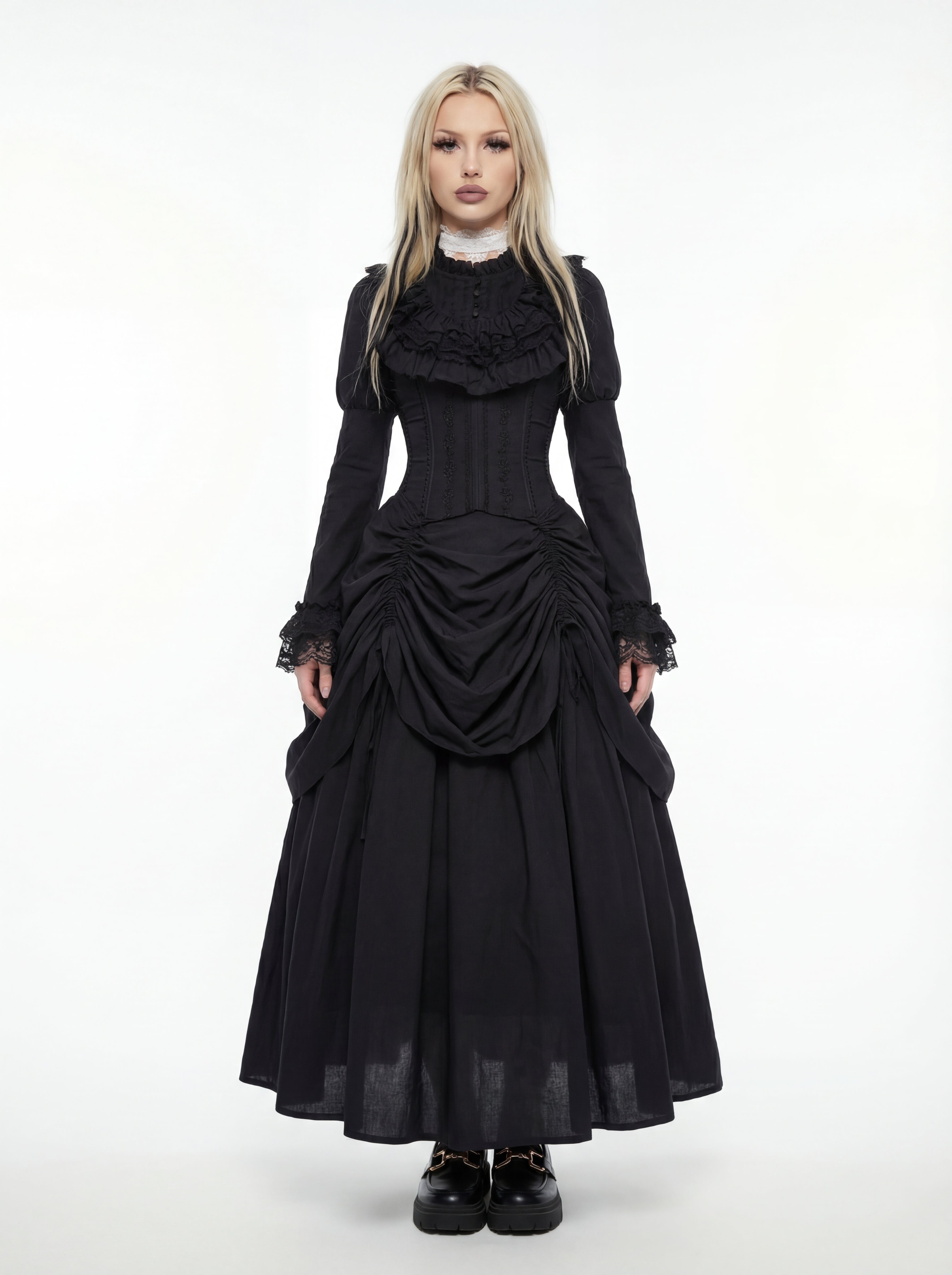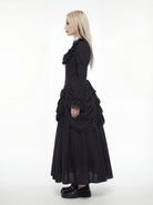 Grief with a regal edge - a high-neck bodice with Victorian ruffles that frame the face like a funeral shroud. The dramatic, gathered bustle skirt drapes in heavy waves, evoking the rugged landscape of a love that transcends the grave. It cinches with lace-up precision and flows like a shadow creeping across a cold stone floor. The essence of the ruin - unyielding, atmospheric, and wickedly stoic.