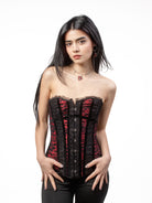 Born of lust and lore - the “Haunt Me” Corset is stitched for shadows, sculpted for sin. A gothic corset that clings like memory and cuts like a whisper. Velvet kisses and venomous curves wrapped in red satin and black lace.